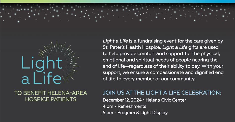 Light A Life is a special fundraiser for the care given by St. Peter’s Health Hospice. Light A Life gifts are used to make this wonderful care available to everyone, regardless of their ability to pay. These funds also help train staff and volunteer on the best ways to provide this compassionate end-of-life care. Our tradition for each donation symbolizing a light for a loved one on the 80-foot evergreen tree at the Helena Civic Center has ended with the loss of the tree in a major wind storm in January 2021. This year, we will continue the new lighted trees display to serve as our Light A Life symbol so the tradition continues.